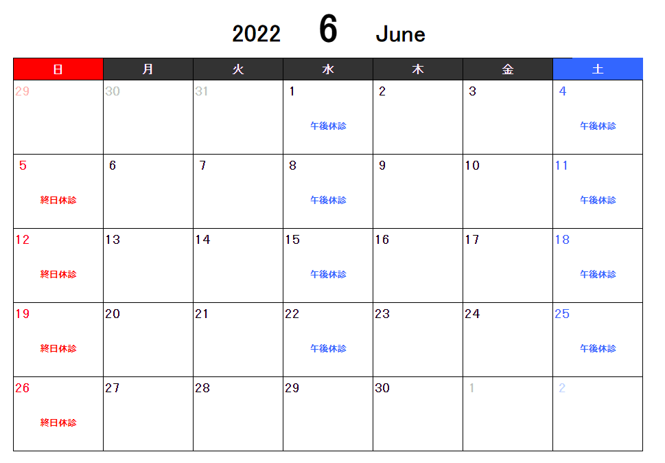 6月1,4,8,11,15,18,22,25,29日午後休診、5,12,19,26日終日休診となります。